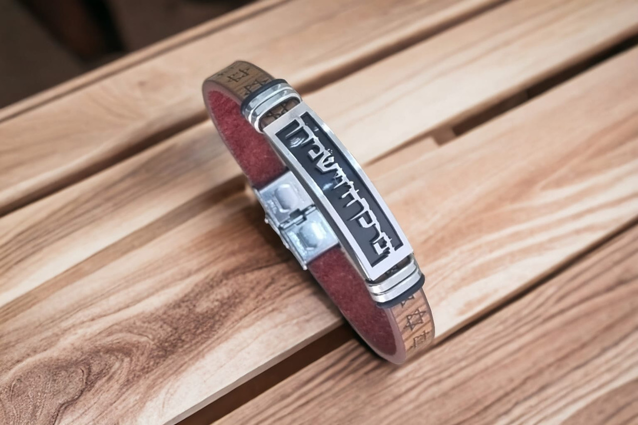 High Quality Genuine Leather Bracelet With Stainles Steel plate Engraved with The Hebrew prayer letters: